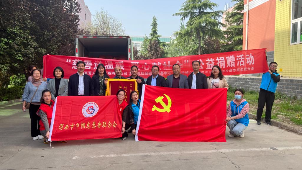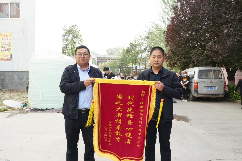 爱心捐赠企业陕西冠天建筑工程有限公司负责人王斌作了发言,他表示“上下同欲者胜,风雨同舟者兴”,并祝愿学校越办越好,桃李满天下。活动最后,由我校后勤服务中心党总支书记邹朋波为爱心企业授锦旗,并集体合影留念记录下这一美好时刻。