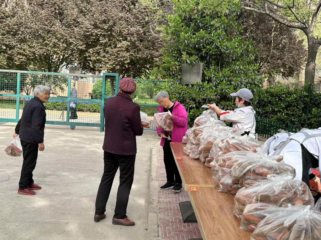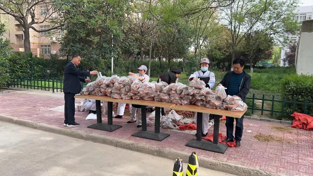 仪式后,后勤饮食管理科进行了捐赠物品分发,受惠群体为朝阳校区学校餐厅以及部分教职工,本次在一餐北二道门给教职工设点分装一百多袋,总计发放了2000斤。